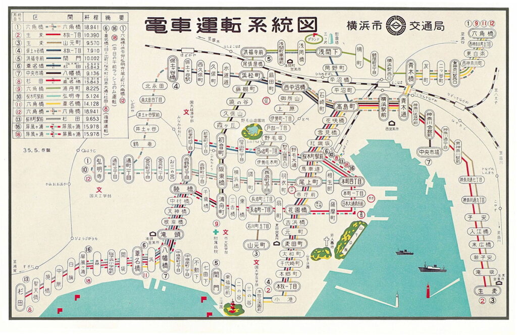 かつての横浜の繁栄は、大岡川河口部の新田開発と、居留地の開発から始まりました。そして市街地は、海沿いと川沿い双方へ伸びていきます。この都市の広がりは、かつて走っていた横浜市電の路線網にみることができます。